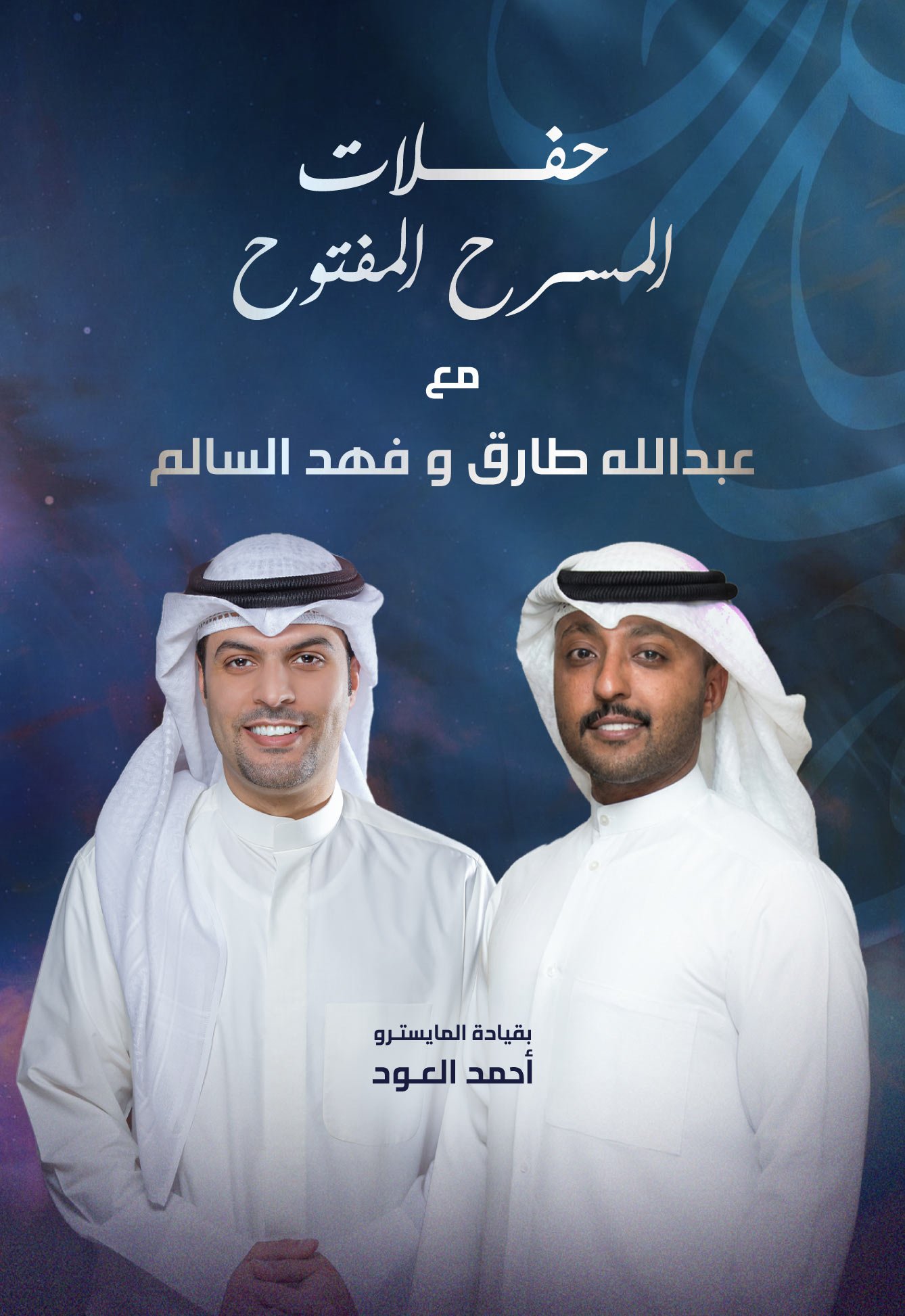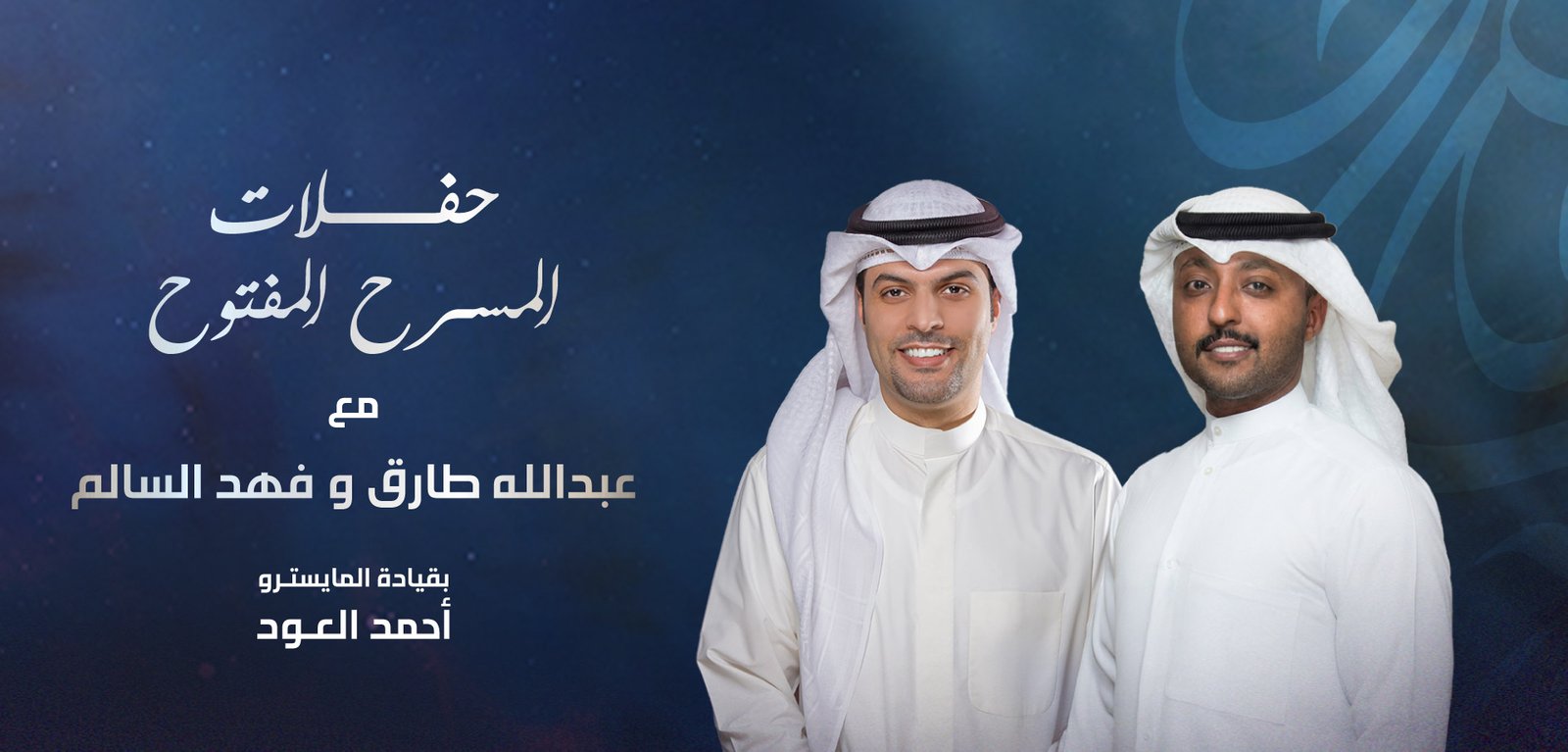 تستمر حفلات المسرح المفتوح بأجوائها المبهجة البسيطة الخالية من الرسمية في شتاء الكويت المنعش، حيث نلتقي مساء الخميس 22 يناير مع اثنين من نجوم الأغنية الشبابية الكويتية وهما الفنانين عبدالله طارق وفهد السالم وأجمل الأغنيات الكويتية والخليجية بمصاحبة الفرقة الموسيقية يقودها المايسترو د. أحمد العود. يعتبر الفنانان عبدالله طارق وفهد السالم من الأصوات المتميزة في جيل الشباب الحالي. انطلقت مسيرة عبدالله طارق الغنائية في العام 2012 عندما فاز بالمركز الأول في البرنامج الغنائي «سمَّعنا صوتك» على محطة «مارينا إف إم» الإذاعية. أما فهد السالم فقد دخل مجال الغناء في سن مبكرة جدّا، فلم يكن عمرُه قد تجاوز 12 عامًا، حينما شارك في عدد من الجلسات الغنائية، أما بداياته الحقيقية فكانت في العام 2013، حيث بدأ في التعاون مع كوكبة من الشعراء والملحنين لتقديم مجموعة من الأغنيات. وحاليًا يحتل السالم وطارق مكانةً متقدمة بين المطربين الشباب الخليجيين.